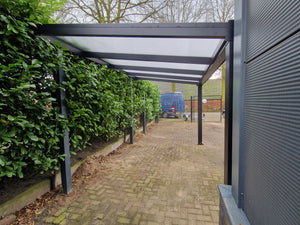 - Deze overkapping wordt op maat geleverd u kunt aangeven bij het bestellen welke maat het precies moet zijn in breedte en uitval.